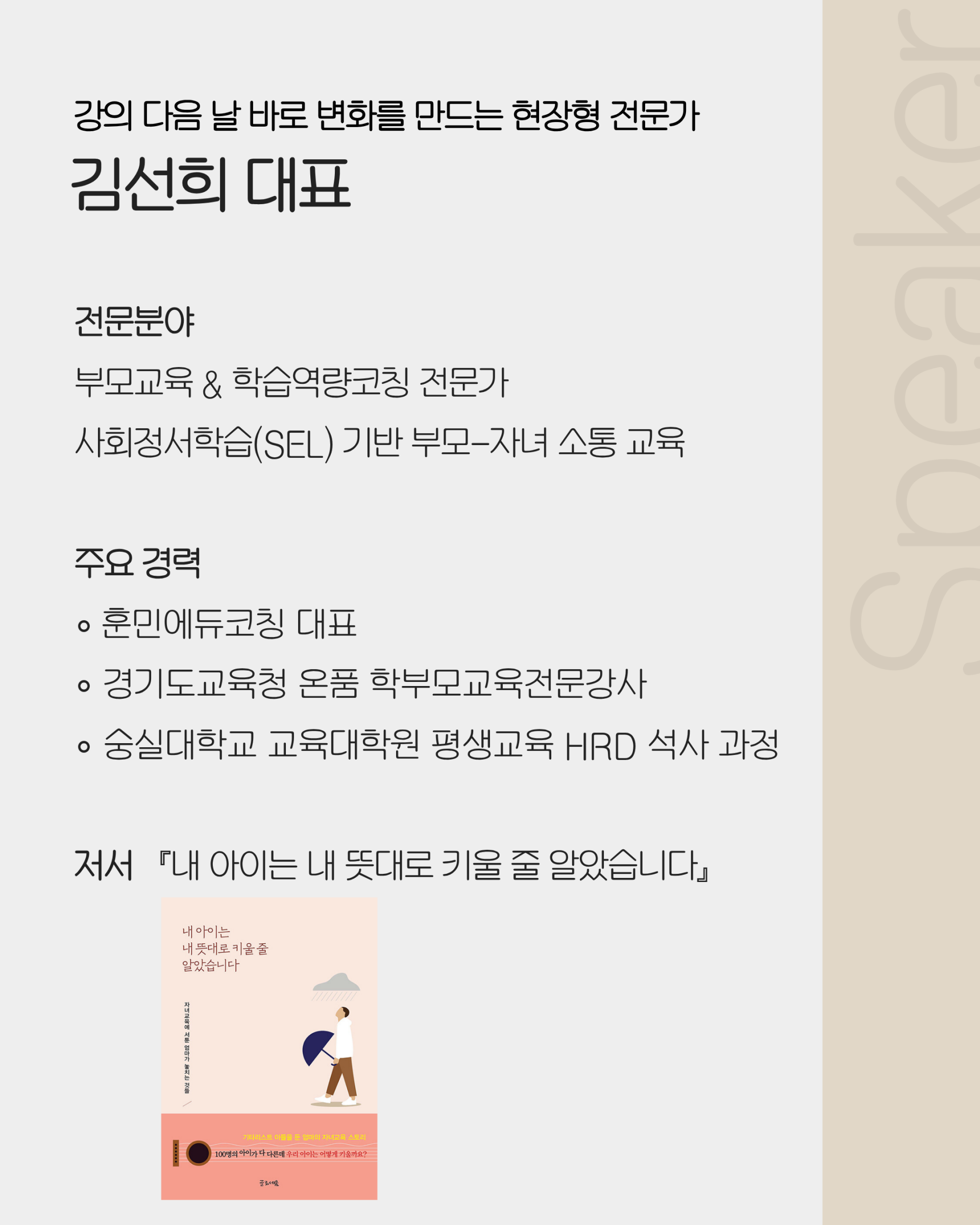 훈민에듀코칭 김선희 대표님께서 다뤄줄 주제입니다.