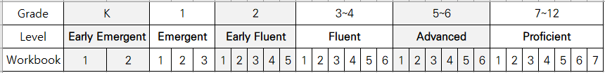 현재 K부터 G5 레벨의 워크북까지 준비되어 있습니다.